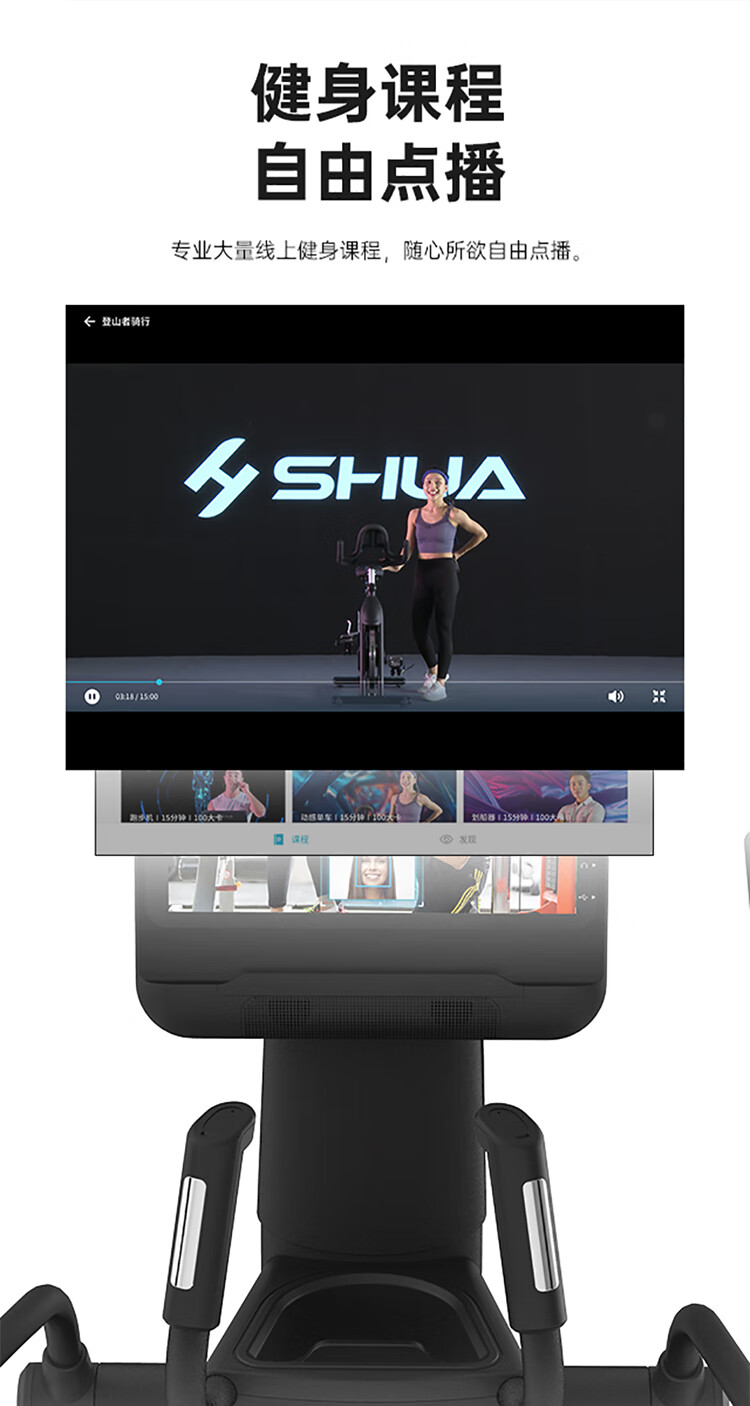舒华高端跑步机SH-T9100T(V10+)拥有超大高清32寸10点触控晶屏的工业屏,具有扫码、刷卡、人脸识别等多种智能登录方式,方便快捷,并且有在线教学、专业健身模式随意切换,让您开启科学健身。