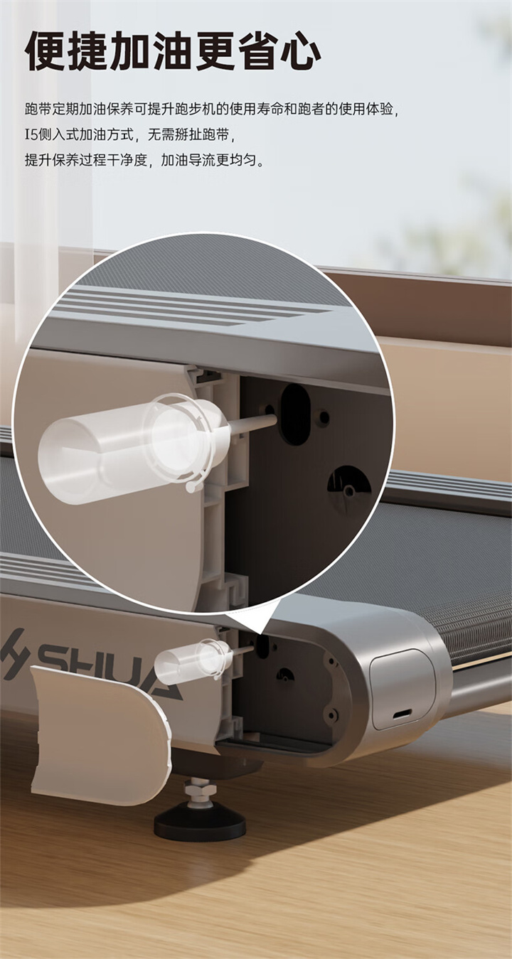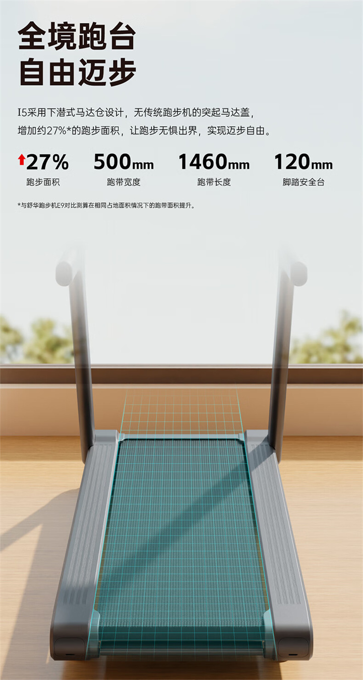 舒华家用跑步机SH-T5100持续马力达1.25HP,具有500×1350mm的跑台,运用无线心率接收模块监测心率,运用6位硅胶减震设计,最大承重是126kg,可以满足大多数家庭的使用。